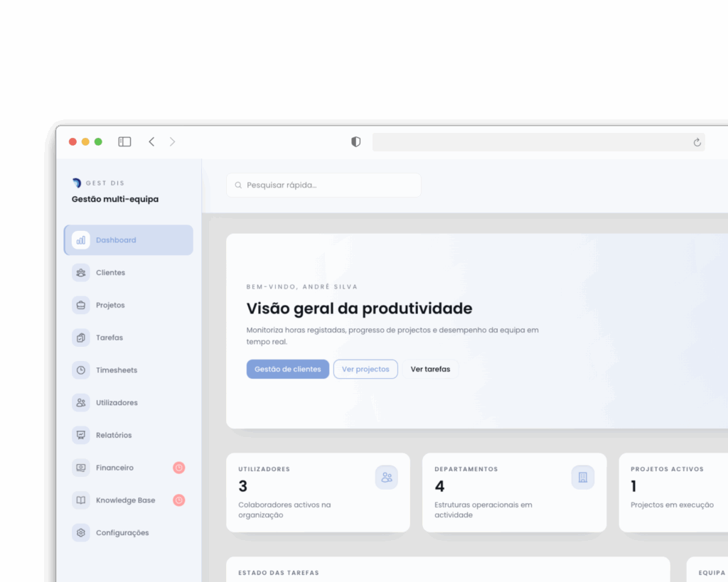 GEST DIS is a 100% digital platform that connects teams, clients and projects in a single, collaborative ecosystem. It allows everything to be monitored in real time – from day-to-day tasks to invoicing – with automation and intelligence.