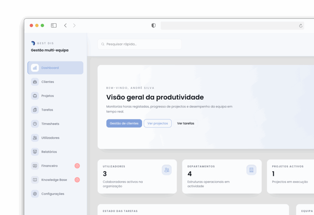 GEST DIS es una plataforma 100% digital que conecta equipos, clientes y proyectos en un único ecosistema colaborativo. Permite controlar todo en tiempo real -desde las tareas cotidianas hasta la facturación- con automatización e inteligencia.